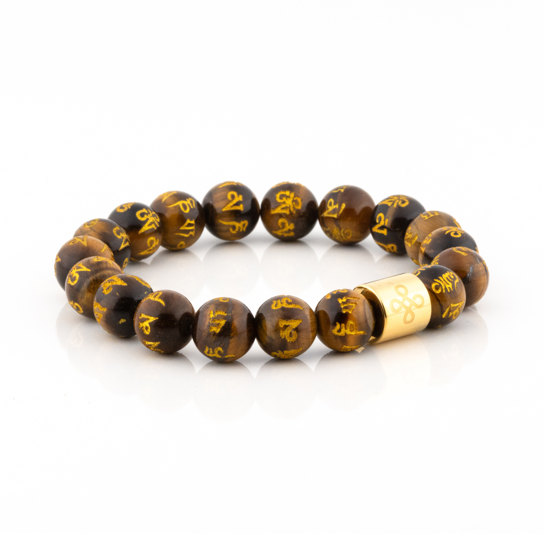 The Brown Tiger's Eye, a gemstone revered for its deep, mesmeric hues that mimic the Earth's natural beauty, is at the heart of this bracelet. Each bead is carefully selected and polished to a soft sheen, reflecting a spectrum of golden browns that dance with the light. But it's not just the visual appeal that sets these stones apart. Engraved with sacred mantras, each bead becomes a vessel of intention and mindfulness, connecting the wearer to ancient wisdom and the grounding energies of the Earth.